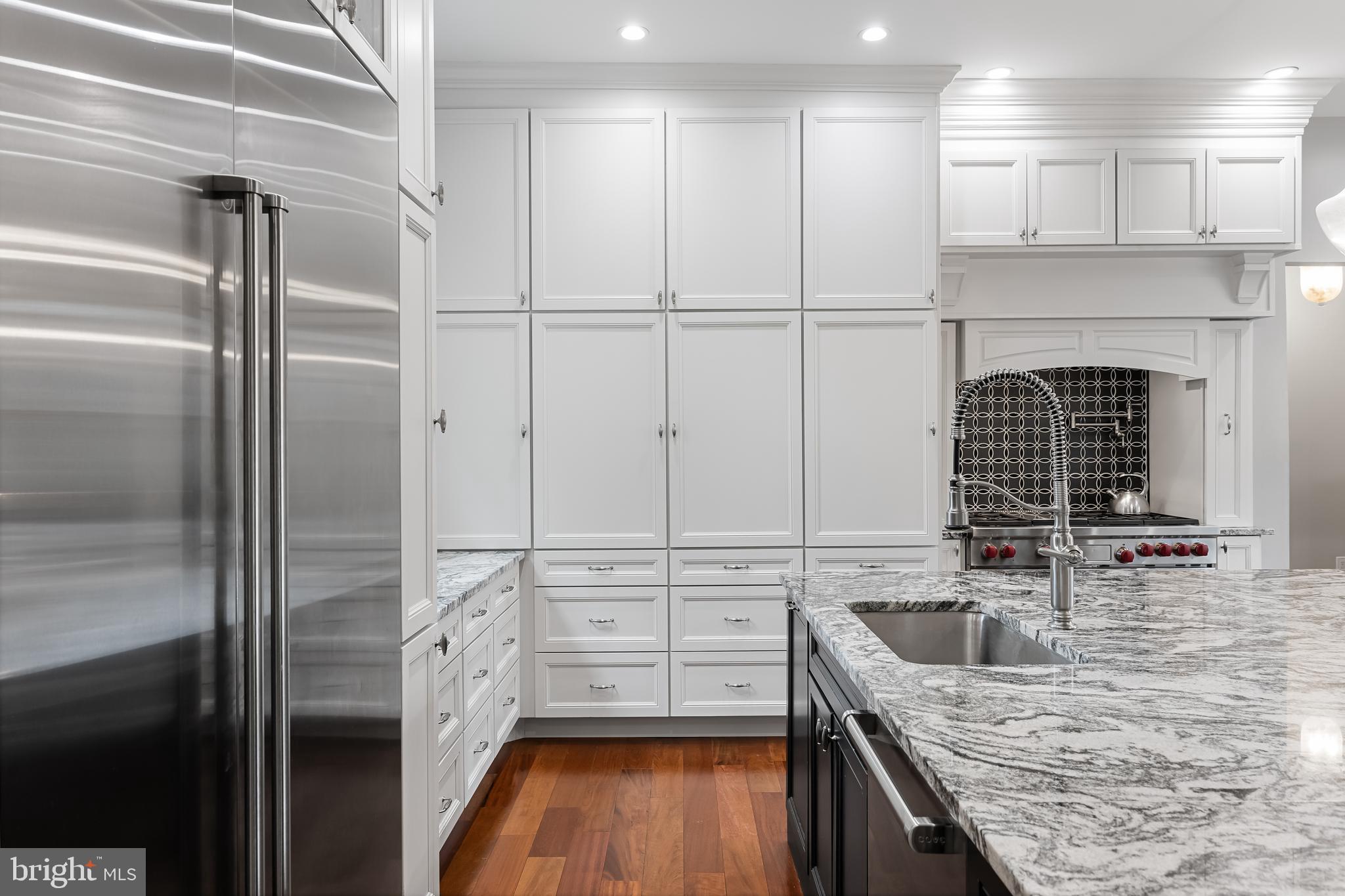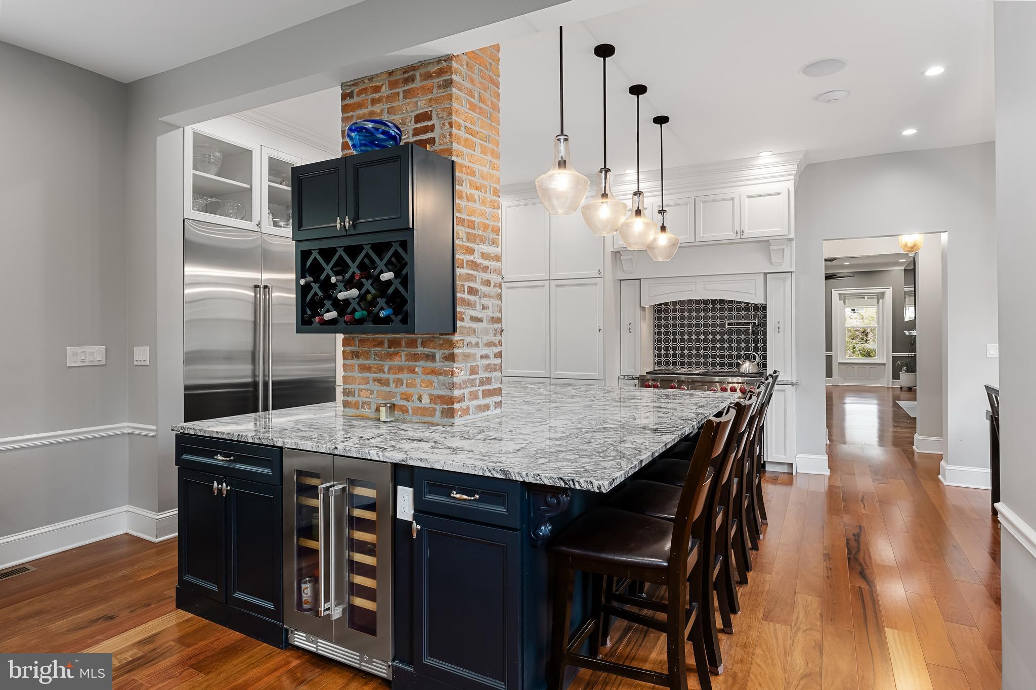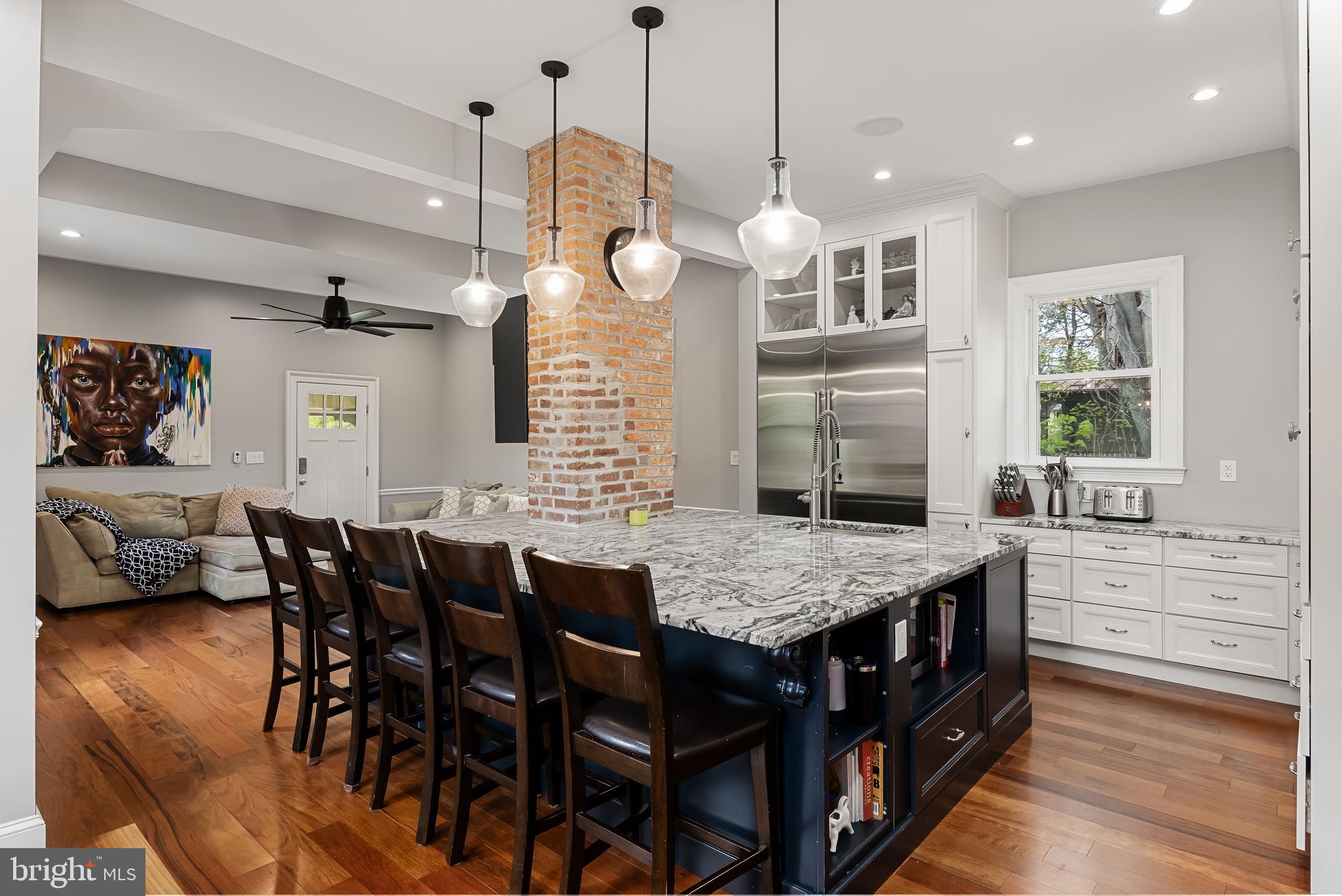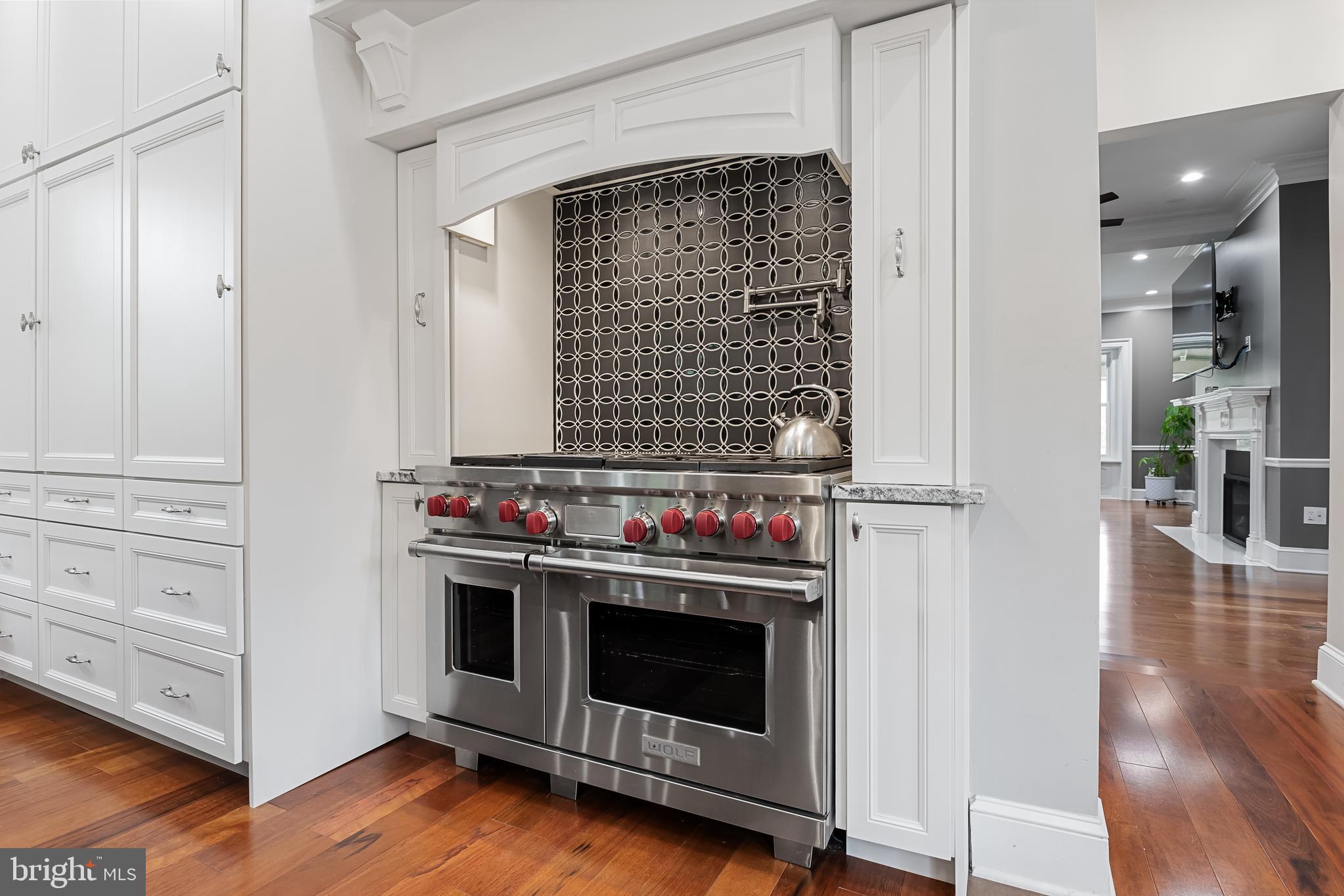 The main level consists of a beautiful foyer with a crystal chandelier, that leads you to the formal living room with a gas fireplace, and ceiling fans, with access points to the half bathroom, screened-in porch, a private office with a pocket door, and the dining area. The dine-in area offers seating space for up to 10 to sit comfortably and connects seamlessly to the family room and kitchen. The open-concept renovated chef's kitchen is a chef's dream, equipped with stainless steel appliances, floor-to-ceiling white cabinets, an oversized granite island, granite countertops, a 48" Wolf gas range, a Sub-Zero refrigerator/freezer, Cove dishwasher, and a separate 24" built-in beverage chiller.