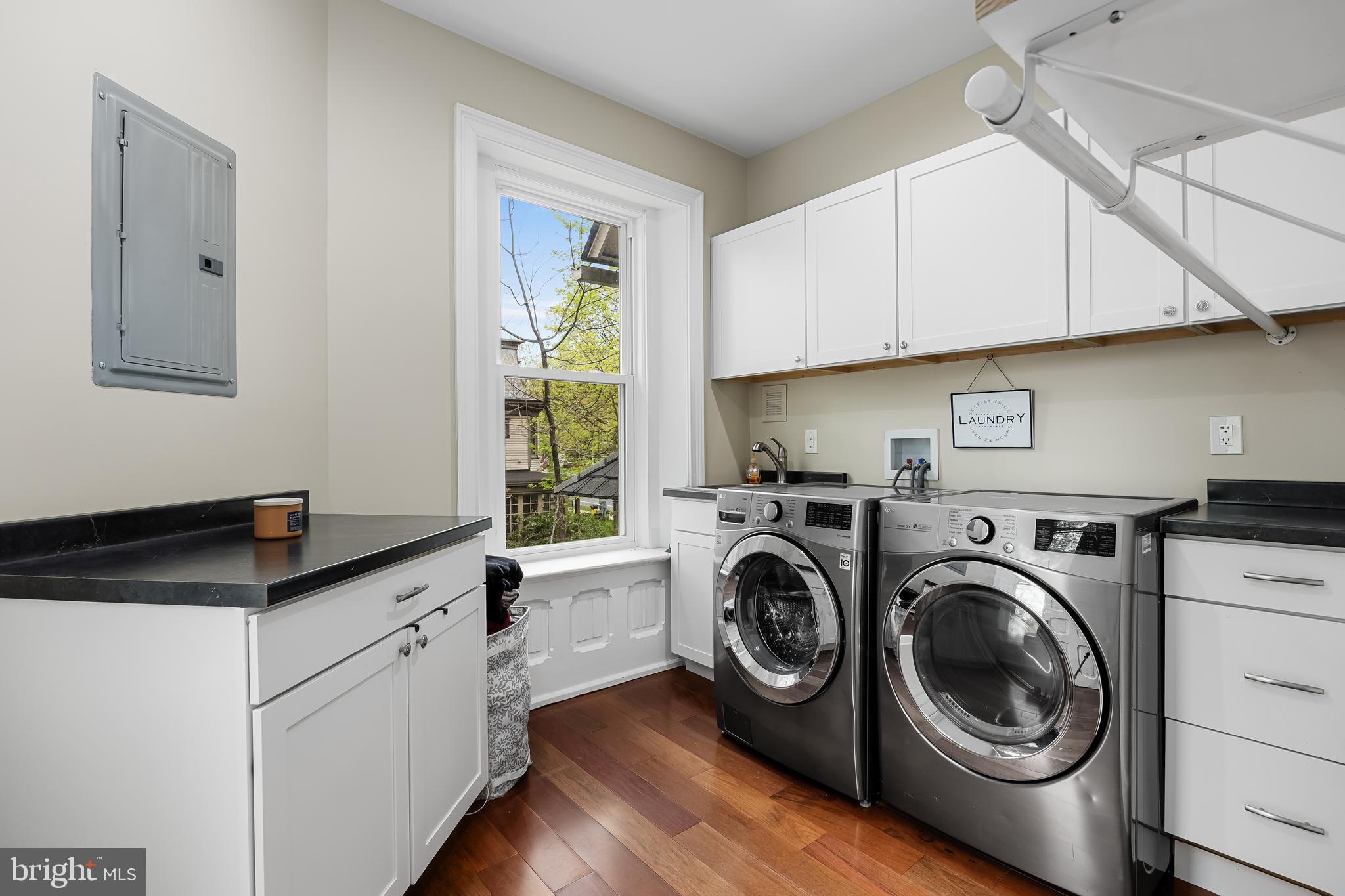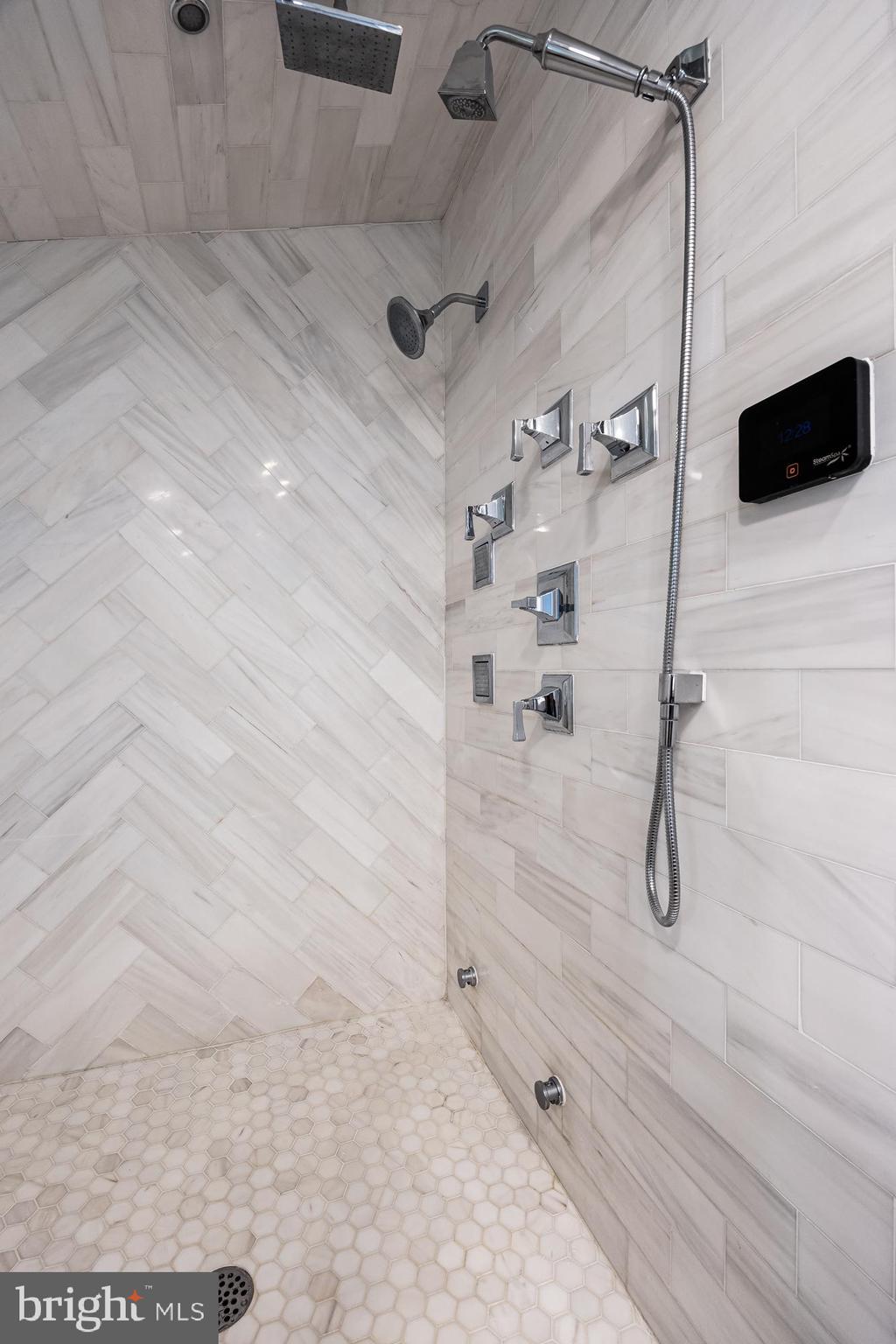 On the second level are 3 bedroom suites, each featuring a private en-suite bathroom. The primary bedroom is a private retreat offering a sitting area, dressing area, dual custom closets, and an ensuite bathroom featuring double sinks with quartz countertops, a soaking tub, marble tiles, and a separate glass-enclosed Kohler steam shower system with integrated aroma and light therapy. Enjoy outdoor privacy and relaxation on the covered balcony, accessed through the primary bathroom. Completing this level is the conveniently located laundry room with a wash sink, cabinetry for storage, countertop space, and front-loading washer and dryer.
